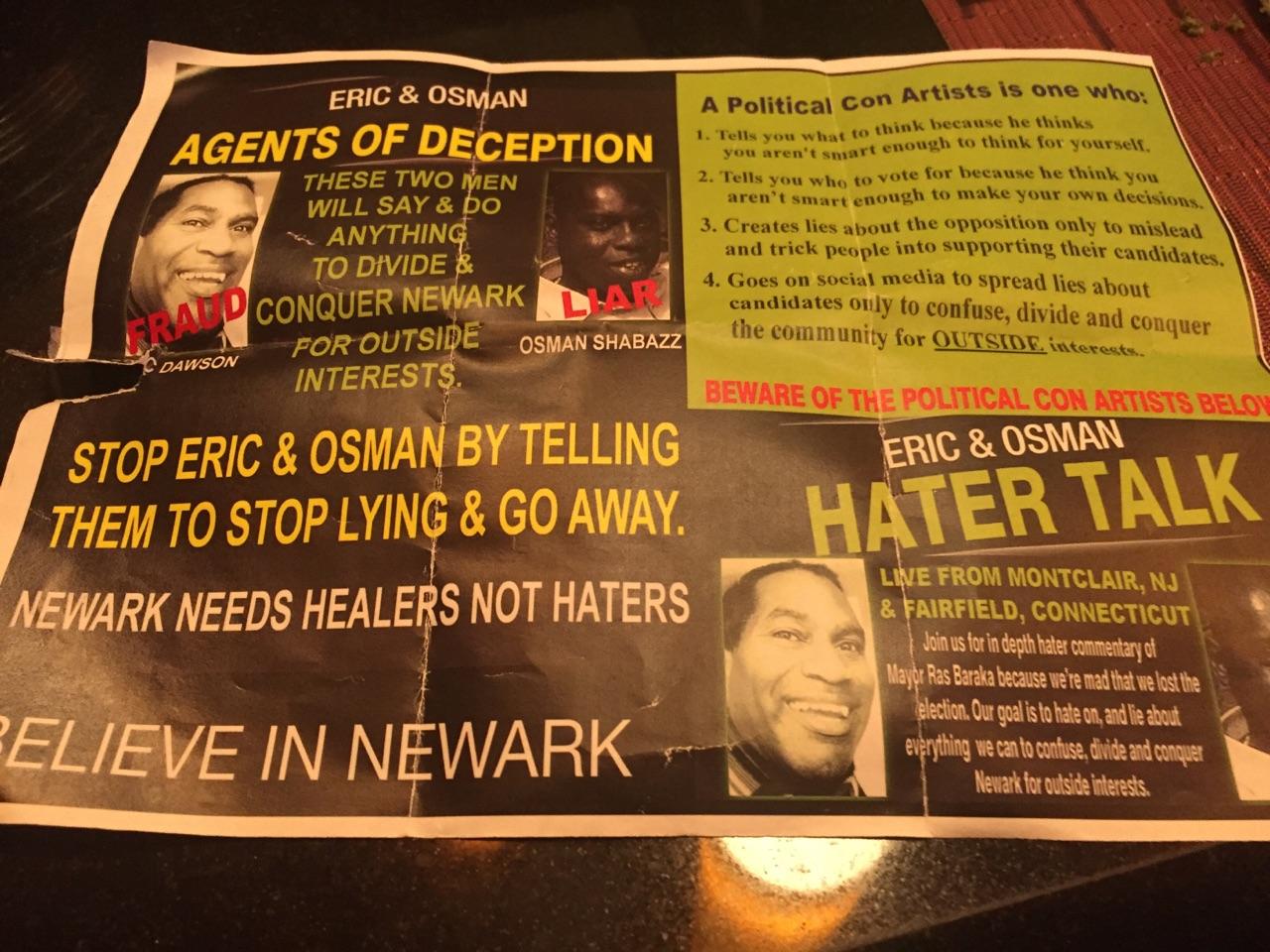 A citywide mailer surfaced in recent days in Newark slapping away at radio show host Eric Dawson, a frequent critic of Mayor Ras Baraka.