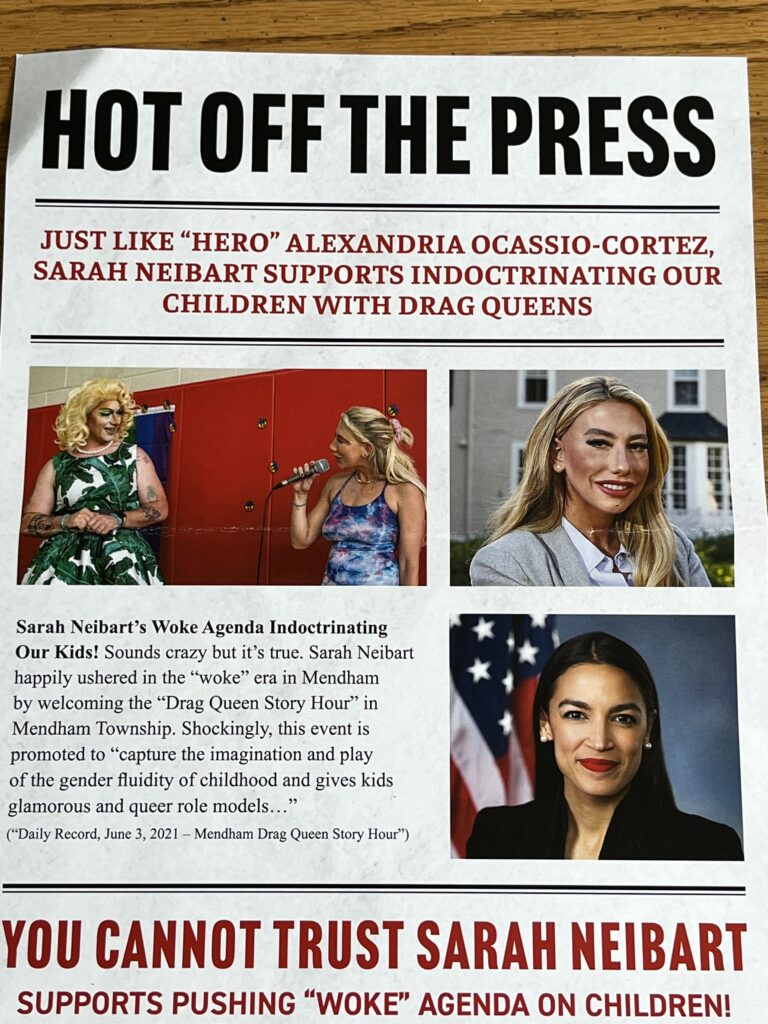 A recent mailer on behalf of incumbent Tom Mastrangelo says that Sarah Neibart, one of his opponents, just like Ocasio Cortez, "supports indoctrinating our children with drag queens."