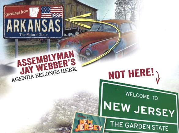 "Out of whack Webber is wrong for New Jersey," the mailer says, noting the Republican's views on abortion, guns and gay marriage.