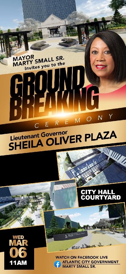 The Atlantic City groundbreaking for the plaza in honor of the late Lieutenant Governor Sheila Oliver will occur next week, on Wednesday, March 6th, in the courtyard of City Hall.