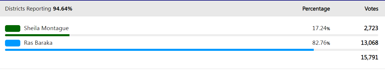 Incumbent Newark Mayor Ras Baraka easily won reelection tonight to a third term, defeating rival Sheila Montague.