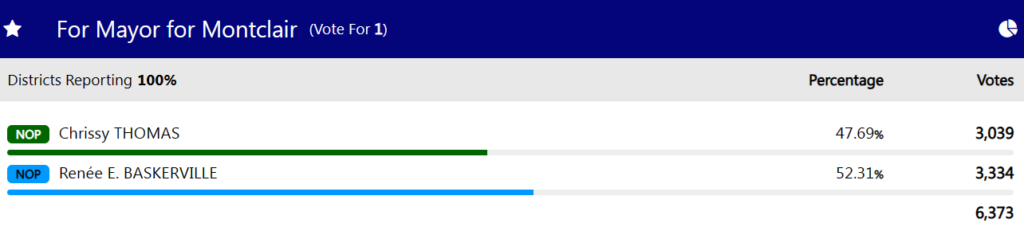 Baskerville Wins Montclair Mayor's Race By Insider NJ | May 14, 2024, 9:32 pm | in Edward Edwards Renee Baskerville has prevailed in the Montclair mayor's race. She defeated rival Chrissy Thomas. Article Tags: Chrissy Thomas Montclair Renee Baskerville Click here for the full Insider Index