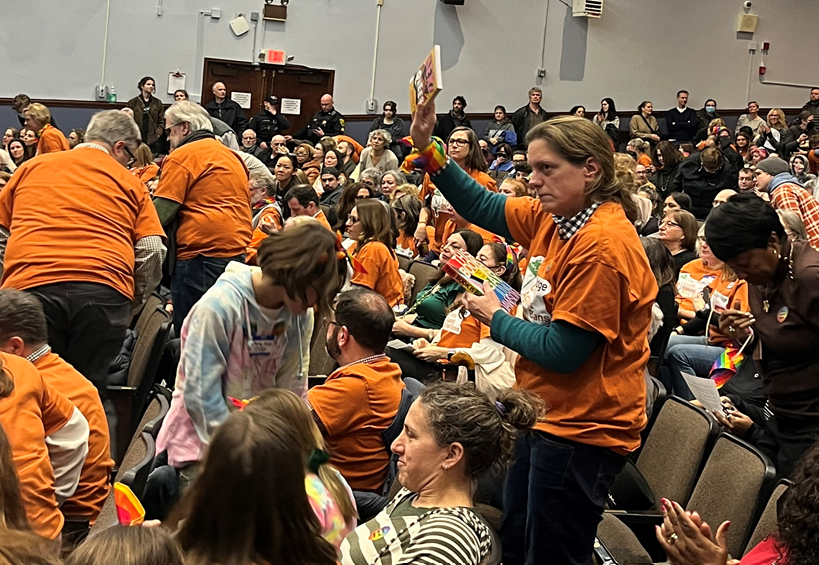 So, the meeting quickly transformed into a rally in support of free speech, gay rights and the ability for people to read what they want. Many in the crowd wore orange T-shirts expressing opposition to book bans. Some came with rainbow scarves or hats to show support for gay rights.