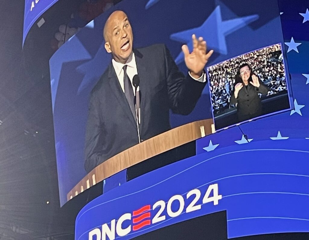Booker later made his second appearance onstage, introducing the parents of an Israel-American hostage held in Gaza.