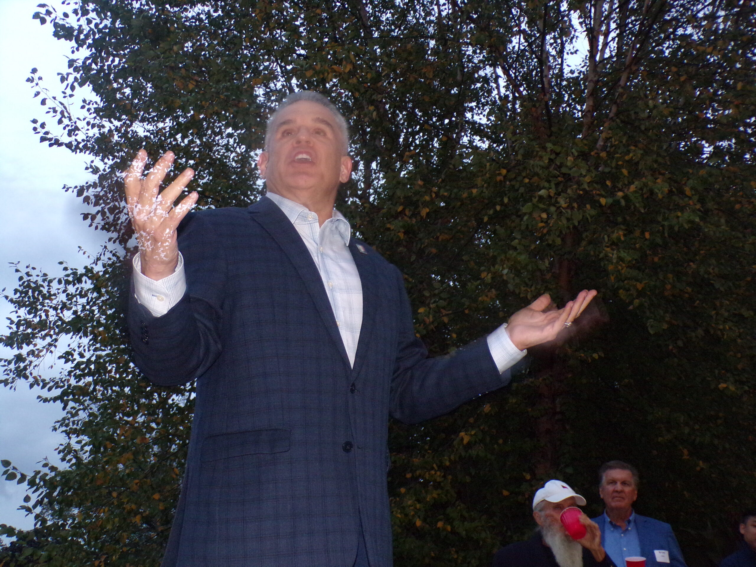 The keynote speaker of the fundraising event was Dan Geltrude, America's accountant, who stood on a chair over the crowd.