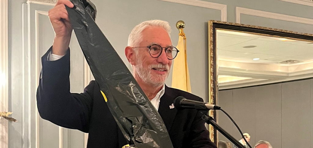 With that, he produced a small box and pulled out a black plastic garbage bag. He held it aloft like a man waving a football over his head after scoring a TD.