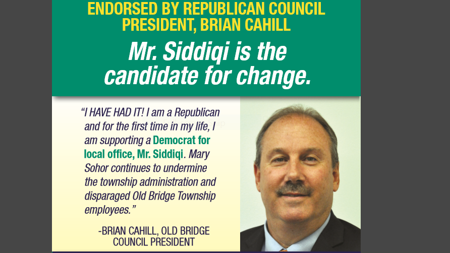 "I have had it," he said in a mail piece that dropped over the weekend. "I am a Republican and for the first time in my life, I am supporting a Democrat for local office, Mr. Siddiqi. Mary Sohor continues to undermine the township administration and disparaged Old Bridge Township employees."