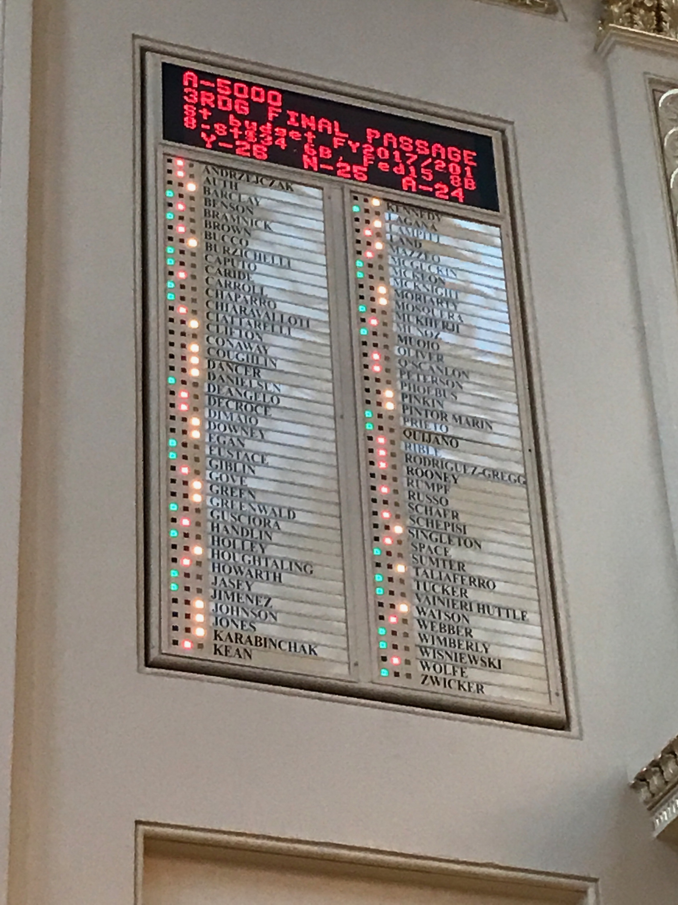 Since yesterday, Assemblyman Kennedy changed his vote from 'aye' to 'abstain'. Assemblymen DeAngelo and Benson flipped from 'abstain' to 'aye', and Assemblyman Brown went from 'abstain' to 'yes' - the lone GOP member voting in favor.