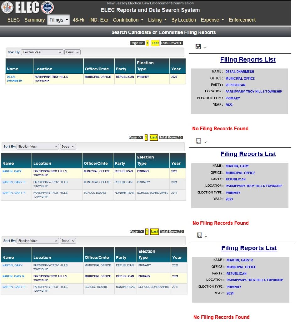 Are Republican Parsippany-Troy Hills Township council candidates Gary Martin and Dharmesh “Danny” Desai in violation of the law for failing to file ELEC reports on time? Their opponents have asserted so in a statement. Incumbent Republican Councilman Paul Carifi, Jr., running with Matt McGrath and Adam Kandil, have called upon the Attorney General and the Morris County Prosecutor’s Office to investigate their primary opponents.