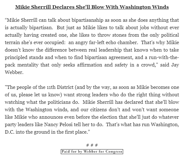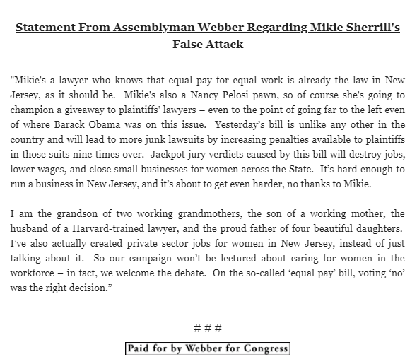 Defending his vote against pay equity legislation yesterday, LD26 Assemblyman Jay Webber fired a statement aimed at presumptive CD11 Democratic candidate Mikie Sherrill today, saying that the presumptive nominee will 'blow with Washington winds' and will be a 'pawn of Nancy Pelosi' who ;doesn't know the difference between real leadership' and a 'run-with-the-pack mentality that only seeks affirmation and safety in a crowd.'