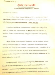 The letter hit the addresses of 2,700 hard Republicans in the blue collar town at the edge of Newark, as Melham – an independent and former Republican – seeks reelection in an Essex County town that Governor Phil Murphy, a Democrat, won 2-1 in 2017, compared to his narrow 200-vote margin over Ciattarelli in 2021.