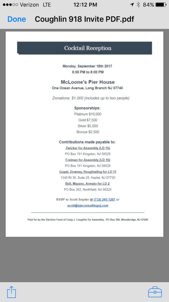 Assemblyman Craig Coughlin (D-19) will anchor a fundraiser on Monday for Democrats in battleground districts.