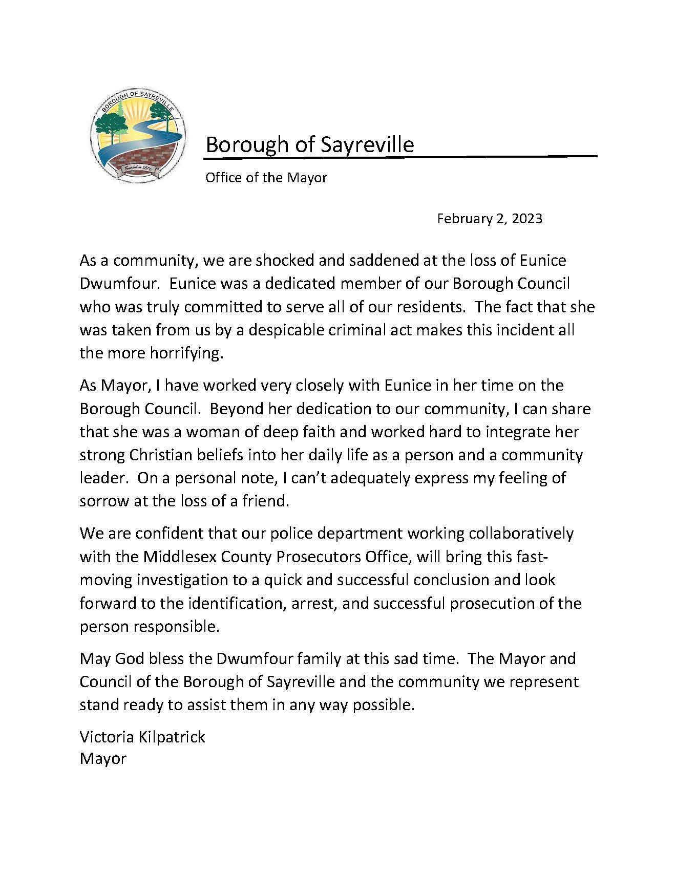 "God bless Sayreville," added the councilwoman, murdered last night.