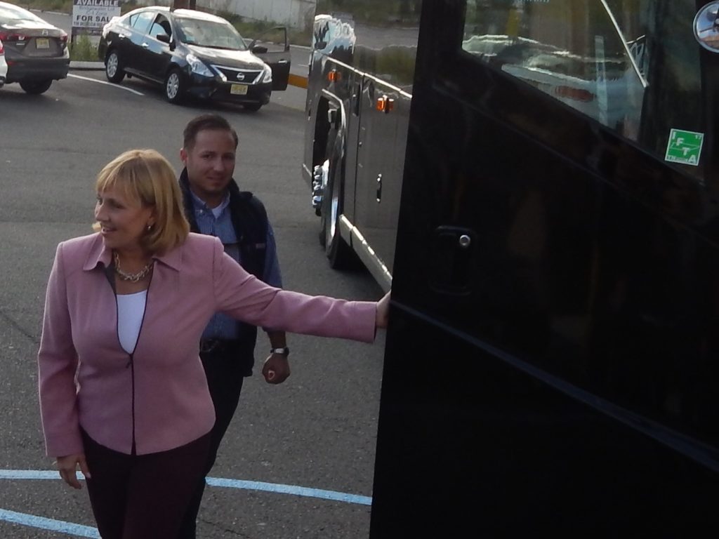 Guadagno has been on a bus tour throughout the state in a proclaimed effort to visit Main Street, not Wall Street. The line is a not too subtle dig at Murphy who made millions of dollars as an executive with Goldman Sachs. Guadagno's stop in Whippany was the fifth of seven stops she had on Sunday.