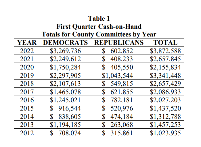 Based on available reports, cash-on-hand for all committees filing reports totaled $3.9 million as of March 31, 2022. Going back to 2012, the previous first quarter high occurred in 2019, when joint reserves totaled $3.3 million.