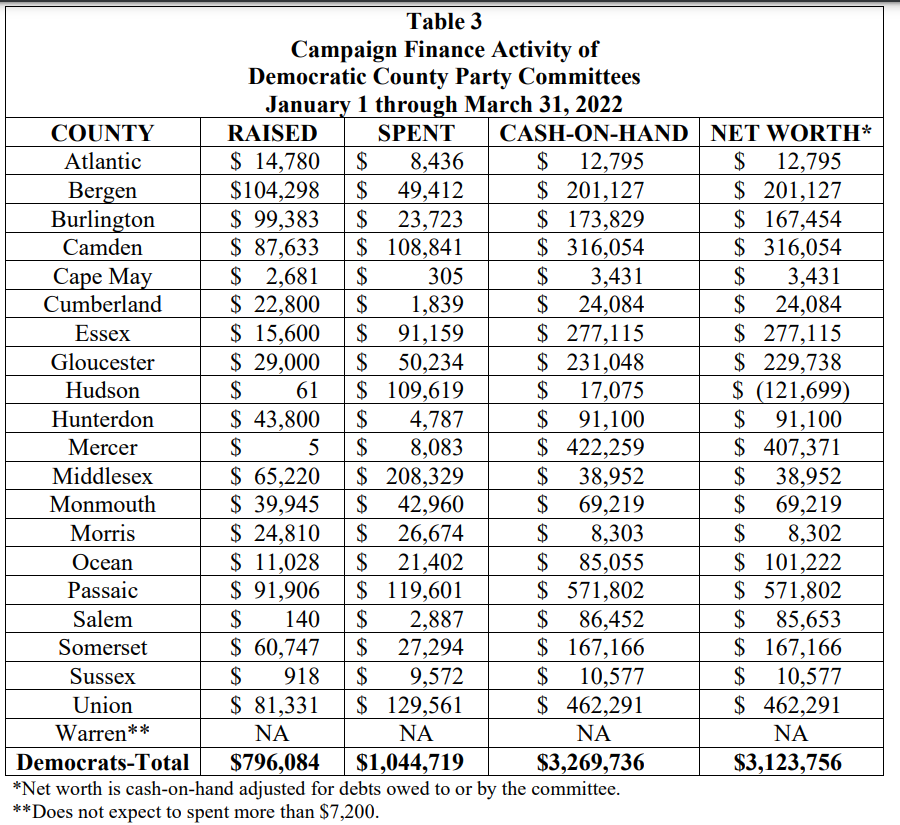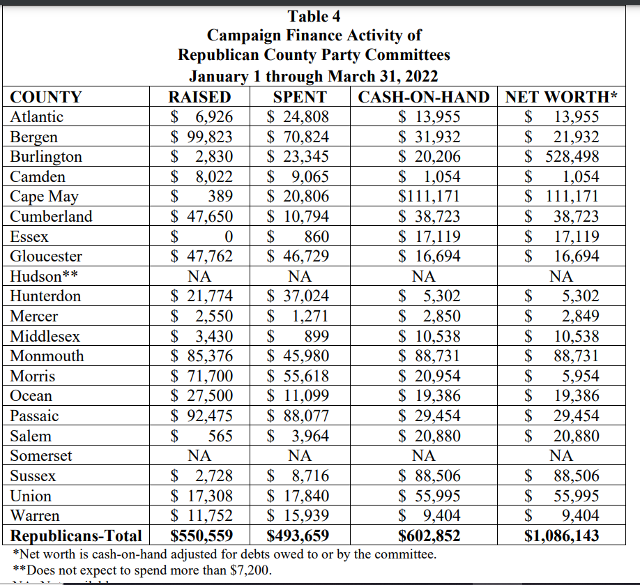 Among Republican county party committees, only Cape May reported more than $100,000 in cash-on hand.