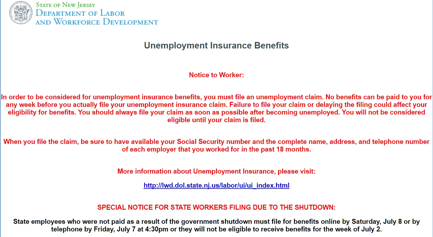 The notice reads: "State employees who were not paid as a result of the government shutdown must file for benefits online by Saturday, July 8 or by telephone by Friday, July 7 at 4:30pm or they will not be eligible to receive benefits for the week of July 2."