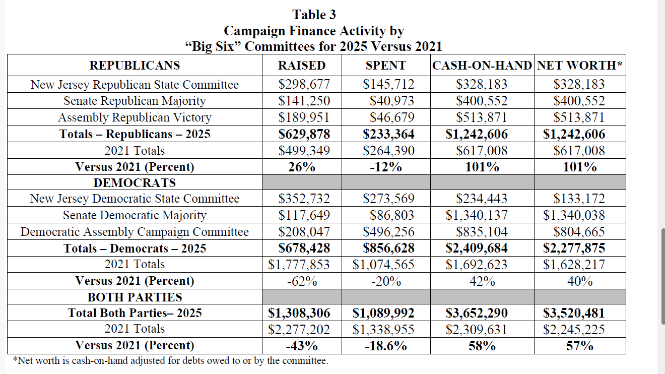 On the plus side, the cash reserves of the “Big Six” committees sit at a level not seen since 2009, according to reports filed with the New Jersey Election Law Enforcement Commission (ELEC).
