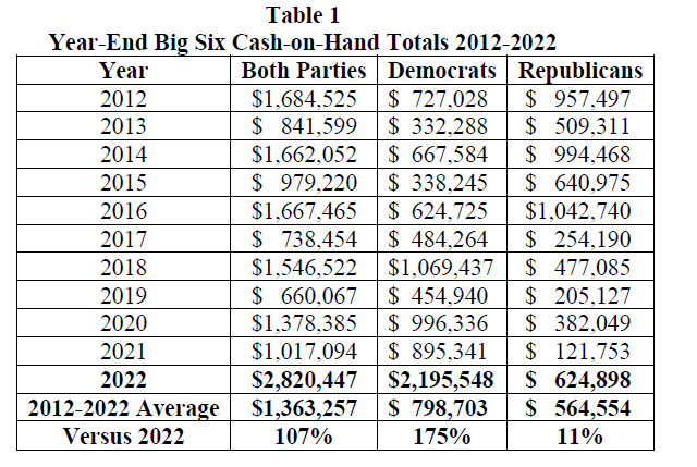 The three Democratic committees jointly reported $2.2 million- the highest in a decade and 175 percent above the party average. Republican counterparts reported $624,898 in the bank- 11 percent above average and the highest since 2016.