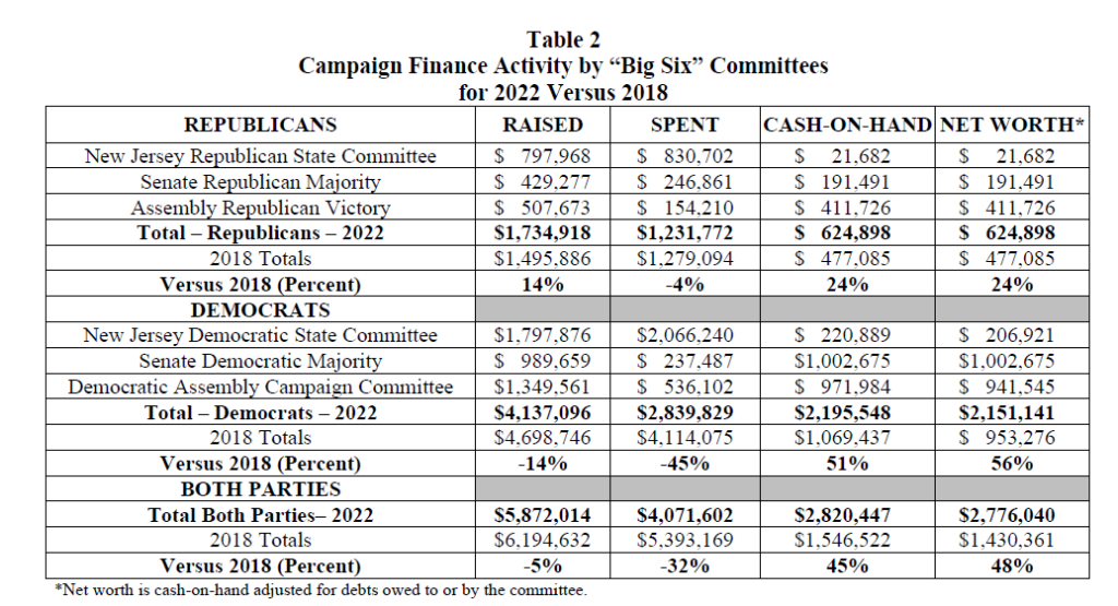 With both legislative houses facing reelection this year, the “Big Six” fund-raising committees- the two state political parties and four legislative leadership committees- have entered 2023 with larger-than usual cash reserves, according to year-end reports filed with the New Jersey Election Law Enforcement Commission (ELEC).