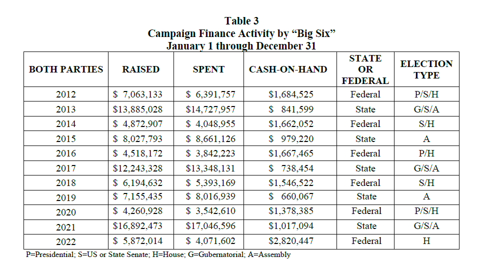 Big Six fund-raising and spending tends to be lower in federal election years than state election years. Totals for 2022 followed this trend.