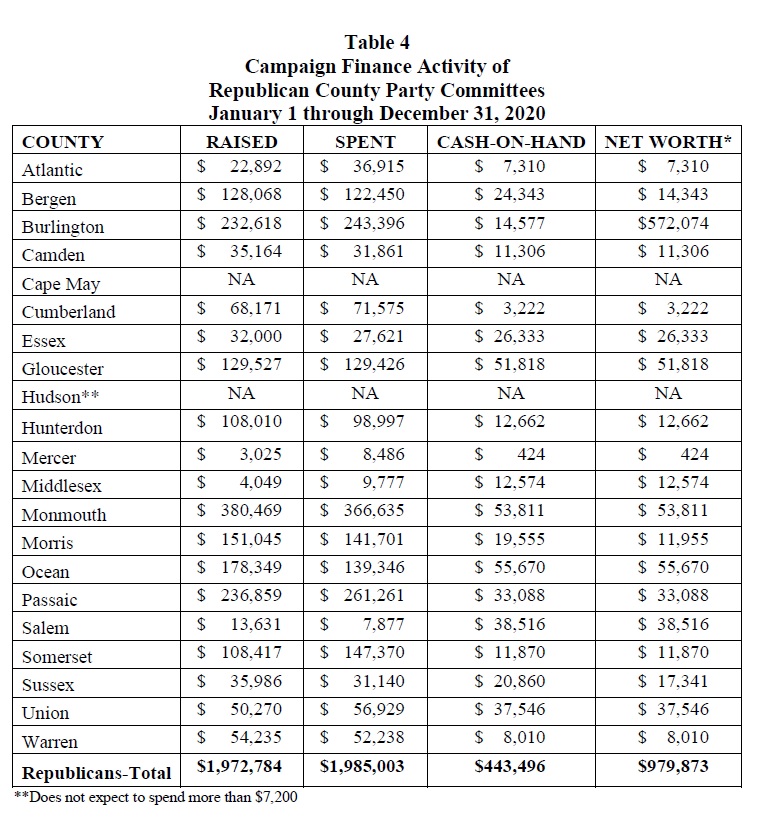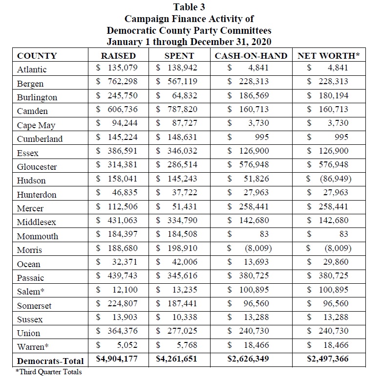 Ten Democratic county party committees- Bergen, Burlington, Camden, Essex, Gloucester, Mercer, Middlesex, Passaic, Salem, and Union- reported more than $100,000 cash-on-hand totals. Hudson and Morris Counties reported a negative net worth, meaning they owe more than their cash reserves.