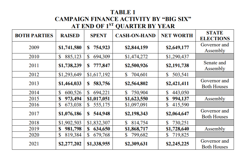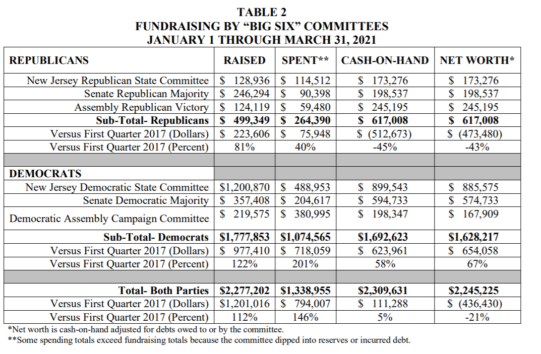 First quarter fundraising by the two state parties and four legislative leadership PACs reached nearly $2.3 million, the highest mark in more than a decade, according to reports filed with the New Jersey Election Law Enforcement Commission (ELEC).