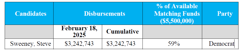 The New Jersey Election Law Enforcement Commission (ELEC) has approved $3,242,743 in public matching funds for a major party candidate (Steve Sweeney) in the 2025 gubernatorial primary election. It is the third disbursement from the state’s Gubernatorial Public Financing Program.