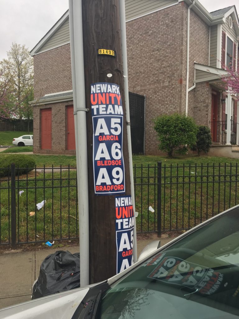 Josephine Garcia and Reggie Bledsoe (the two other candidates on the so-called Board of Education unity slate) appear with Pat Bradford. An employee of the city fire department, Bradford is a Mayor Ras Baraka loyalist.