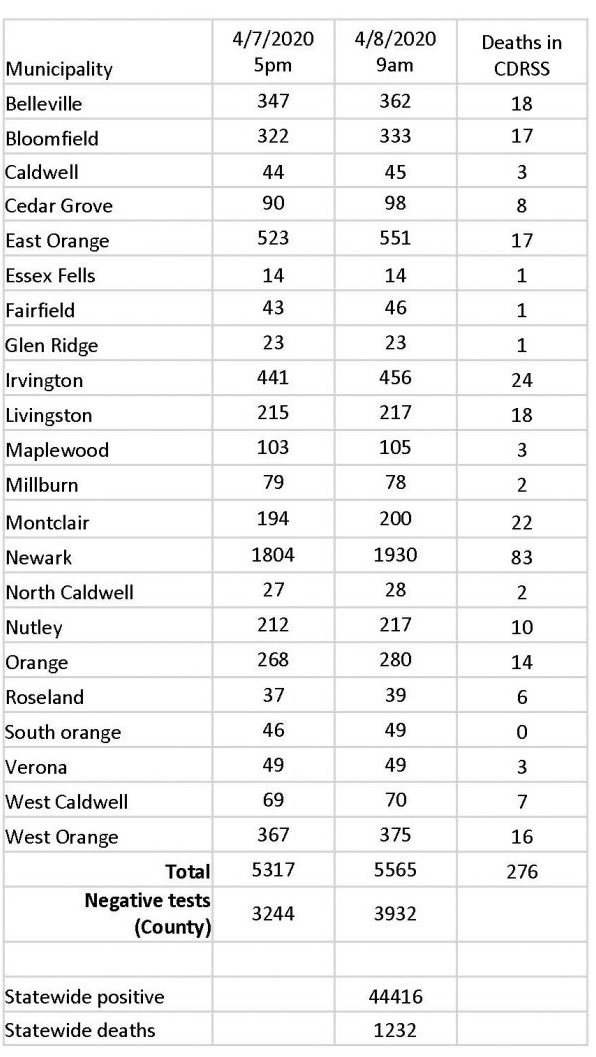 Essex County reports a total of 5,565 COVID-19 cases and 279 fatalities as of Wednesday, April 8th.