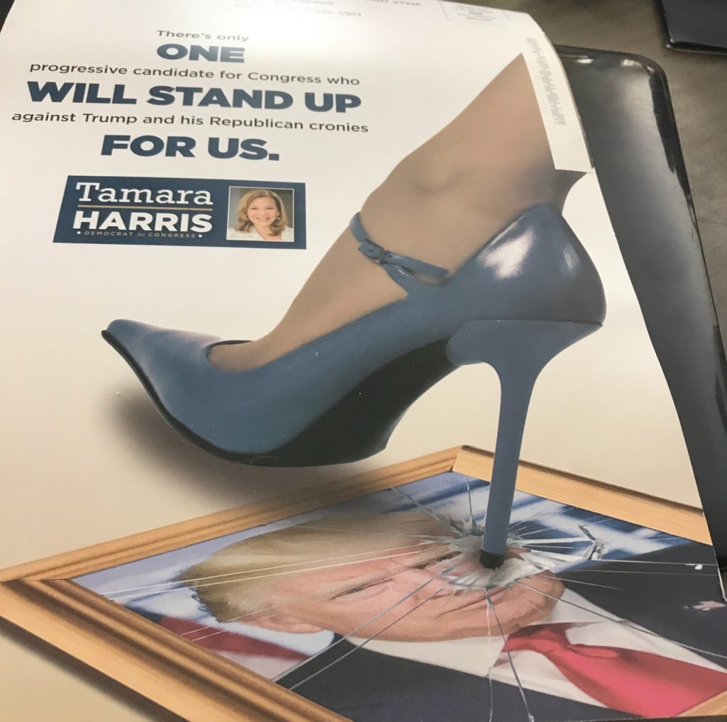 Harris, from Verona, is proclaiming she is a “no-nonsense progressive” whose top priorities include impeaching the President. While in a piece of Sherrill’s literature picked up at her Morristown storefront there is no mention of President Trump. Harris’s latest mailer depicts the foot of a woman in a spiked blue heel using that heel to shatter the class on a framed picture of the President.