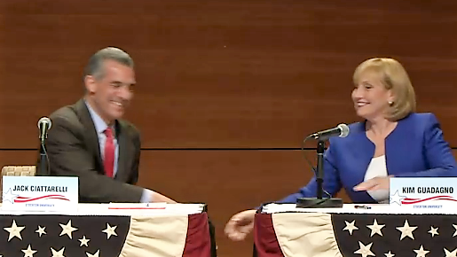 GOP gubernatorial candidates Lieutenant Governor Kim Guadagno and Assemblyman Jack Ciattarelli (R-16) debated tonight at Stockton University for the first time, frequently clashing as they sized up the school funding formula, property taxes and their respective government records.
