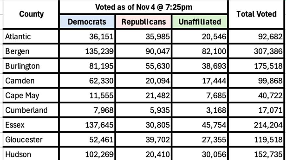 But most sources see high turnout everywhere - including (and especially) in Essex County, which has the largest Democratic Party plurality in the state - as a good sign for Mikie Sherrill, who hails from Essex.