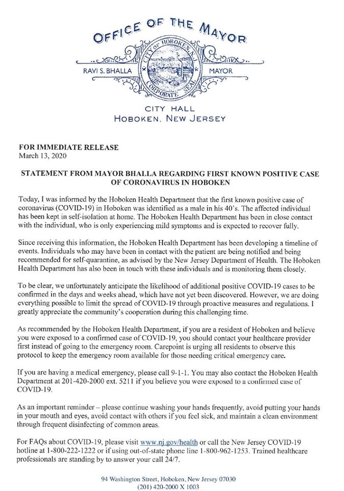 'I was informed by the Hoboken Health Department today of the first known positive case of COVID-19 in Hoboken. Our Hoboken Health Department has been in close contact, and the individual - who is experiencing mild symptoms and expected to fully recover - is in self-isolation at home.