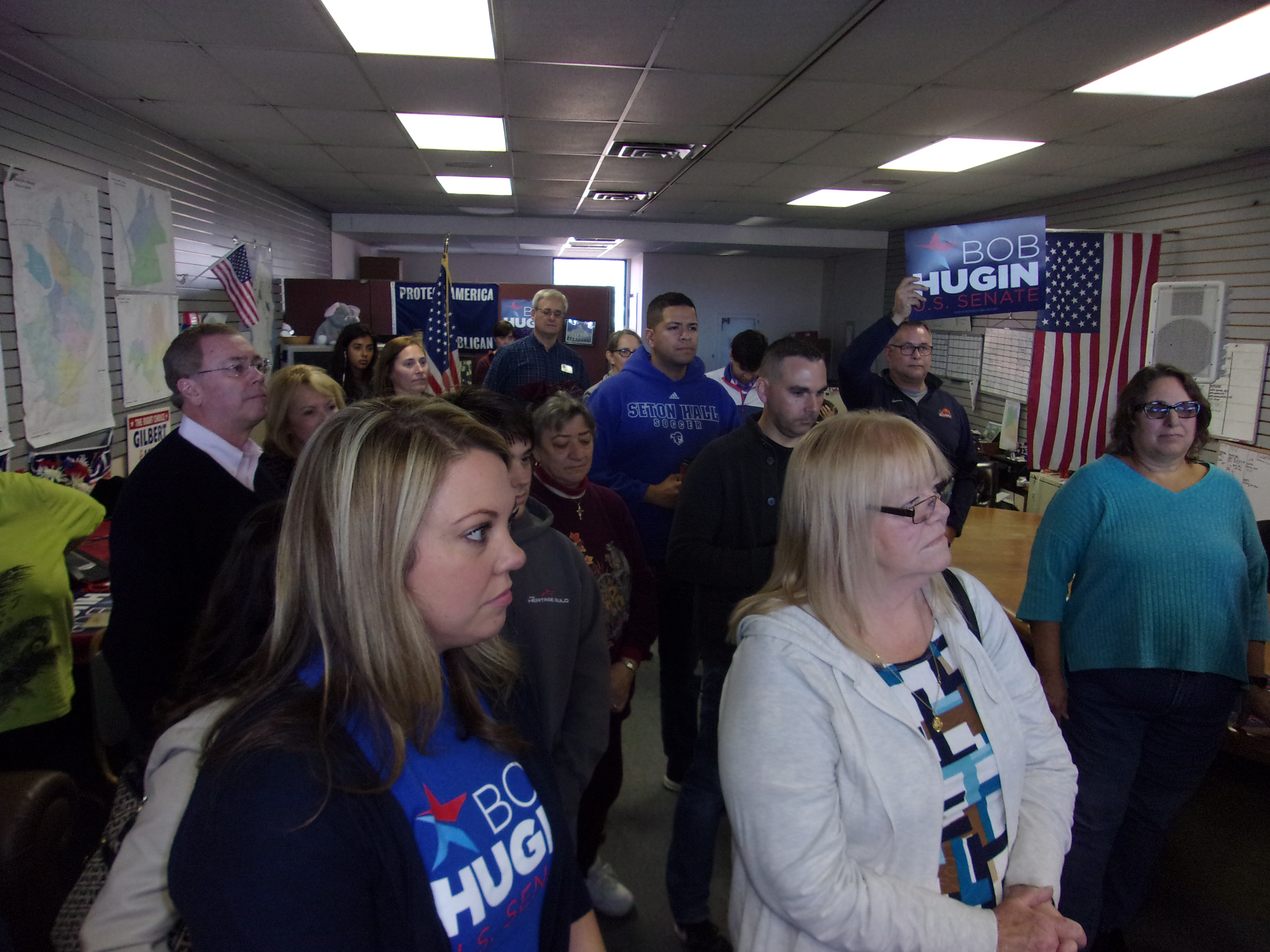 FLEMINGTON - Bob Hugin rolled in here this afternoon on the heels of a "Beers with Bob" event he did last night, which he touted to the crowd crammed into party headquarters on the side of the semi-busy (for Hunterdon) traffic circle.