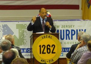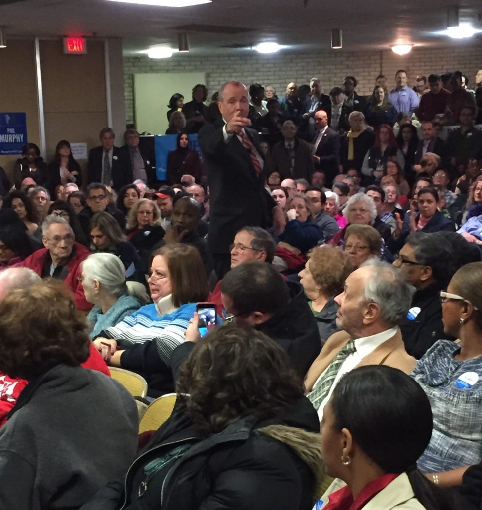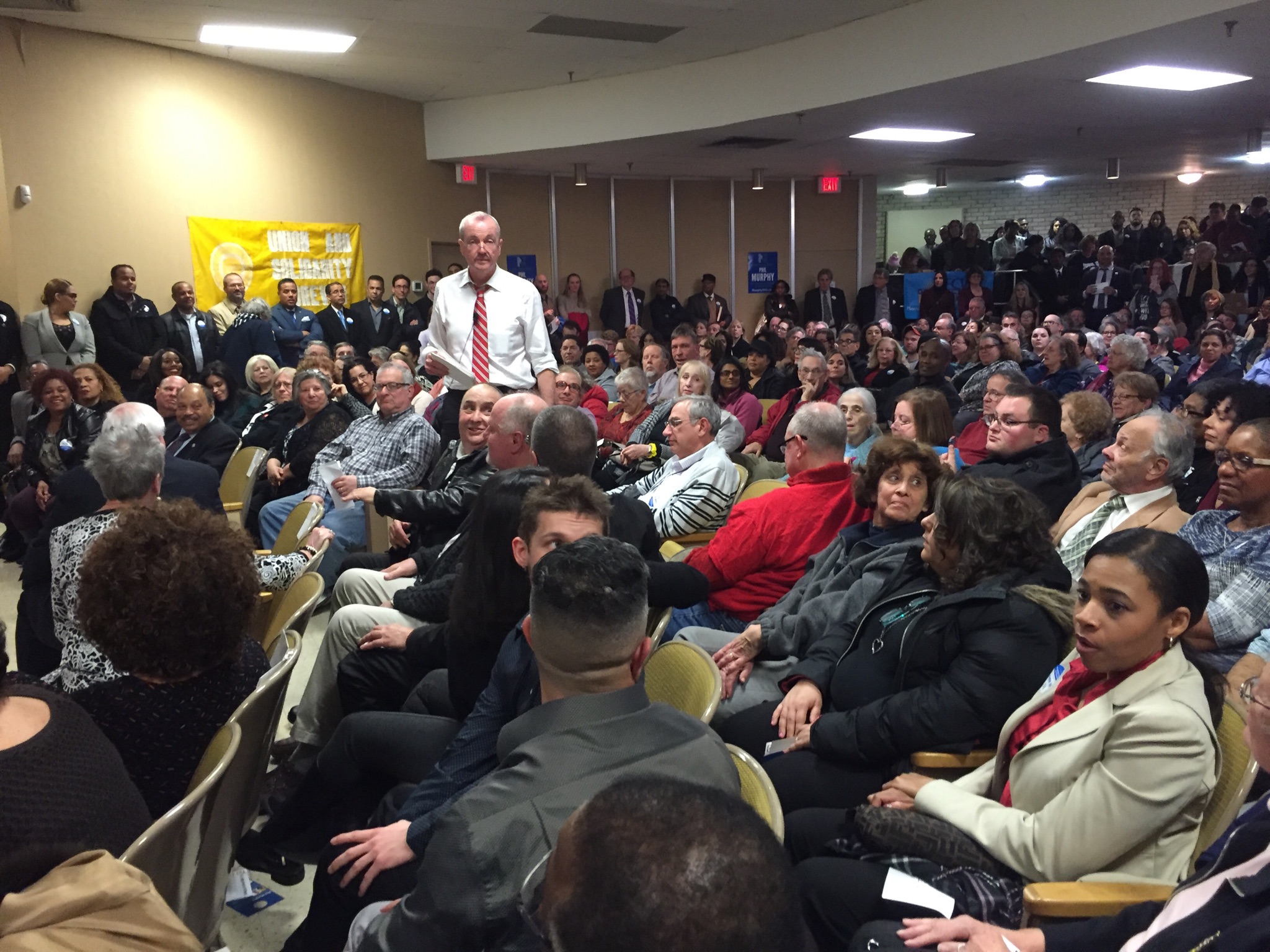 The Murphy campaign should have brought extra chairs. Eh, it wouldn't have done any good. Even with 300 nailed-down auditorium-style seats and plenty of folding chairs, they were a precious commodity - worth the investment for those who arrived early - as over 400 people packed into the Local 1262 union hall in Clifton Tuesday evening. Springsteen played on the loudspeakers, as the white walls of the union hall were increasingly lined with the seatless, awaiting another Monmouth resident and the real star of the night's event: Phil Murphy.
