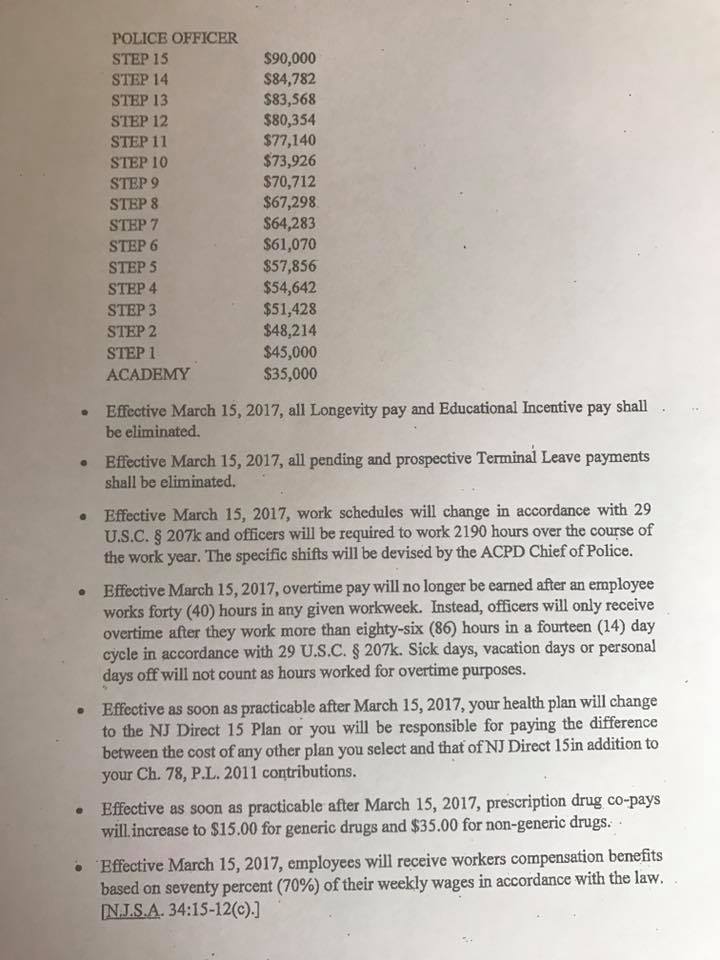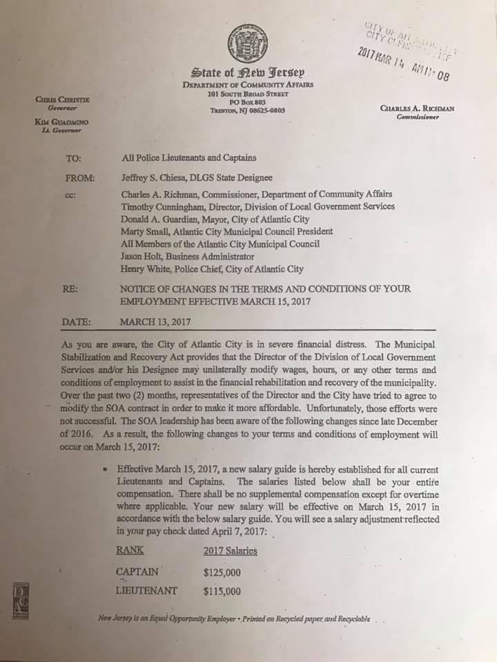 South Jersey radio show host Harry Hurley is reporting that Atlantic City Chief Executive Officer Jeff Chiesa's action plan for the city includes substantial salary and fringe benefits reductions for Atlantic City Police Captains, Lieutenants Sergeants and Officers.