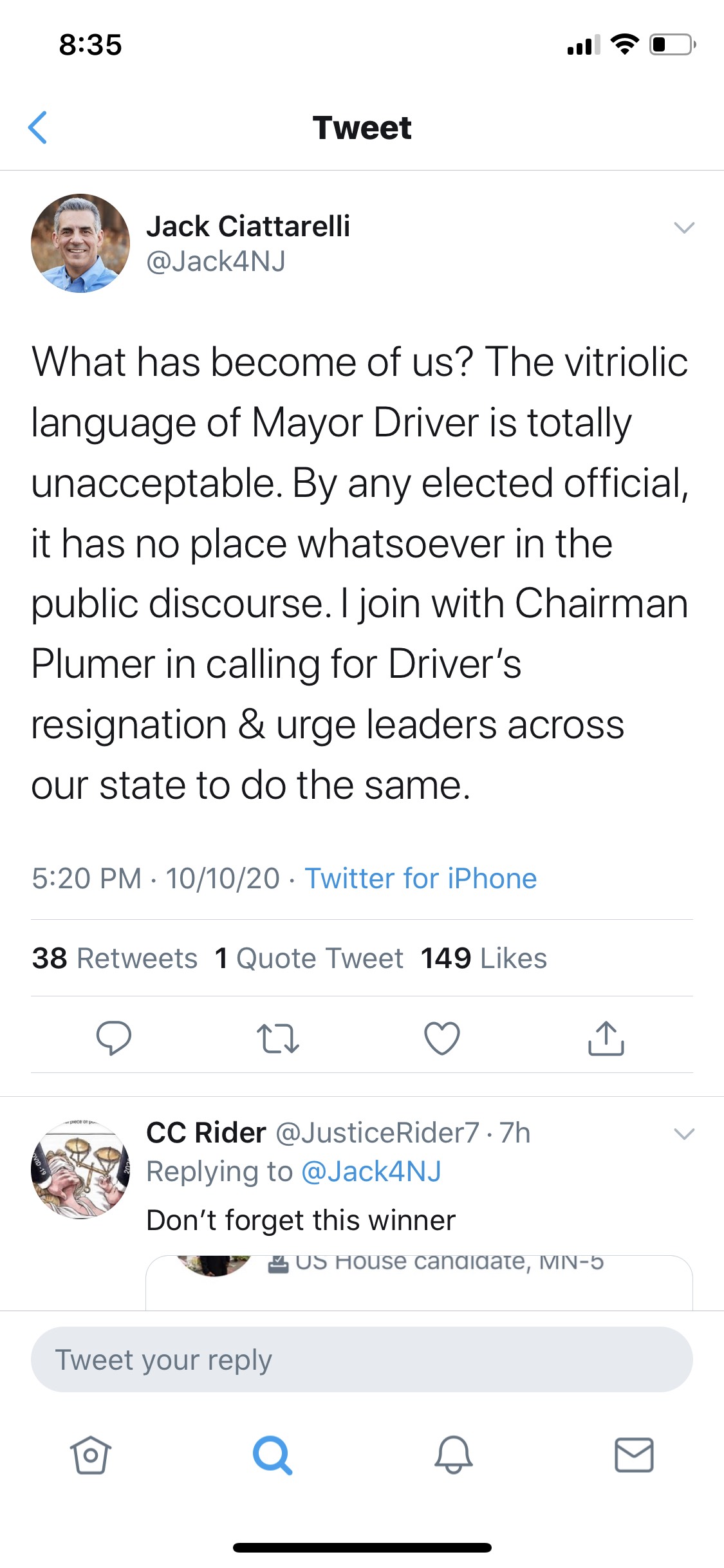 Gubernatorial candidate Jack Ciattarelli likewise jumped on the post with a tweet.