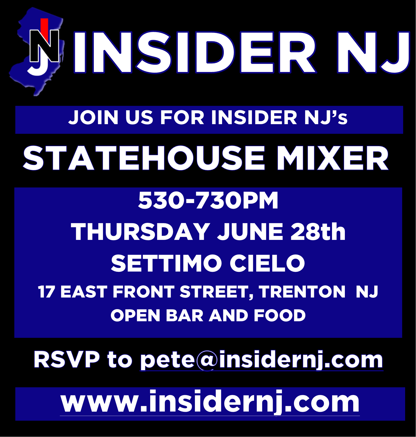 Join Insider NJ for our 2nd Annual Statehouse Mixer tonight from 530pm-730pm at Settimo Cielo. We'll have an open bar and plenty of food, along with plenty of conversation, so if you need a break from budget season, feel free to come by.