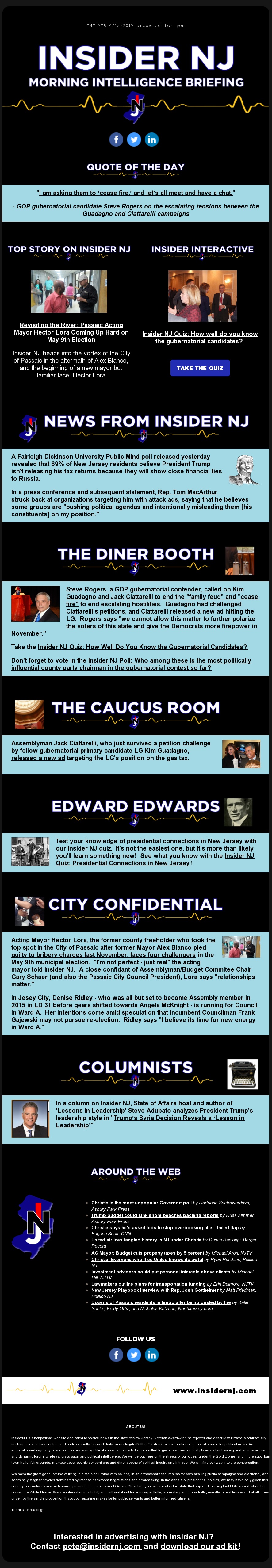 Don't forget to sign up for Insider NJ's daily email here. Below is the Insider NJ Morning Intelligence Briefing for 4/13/2017.