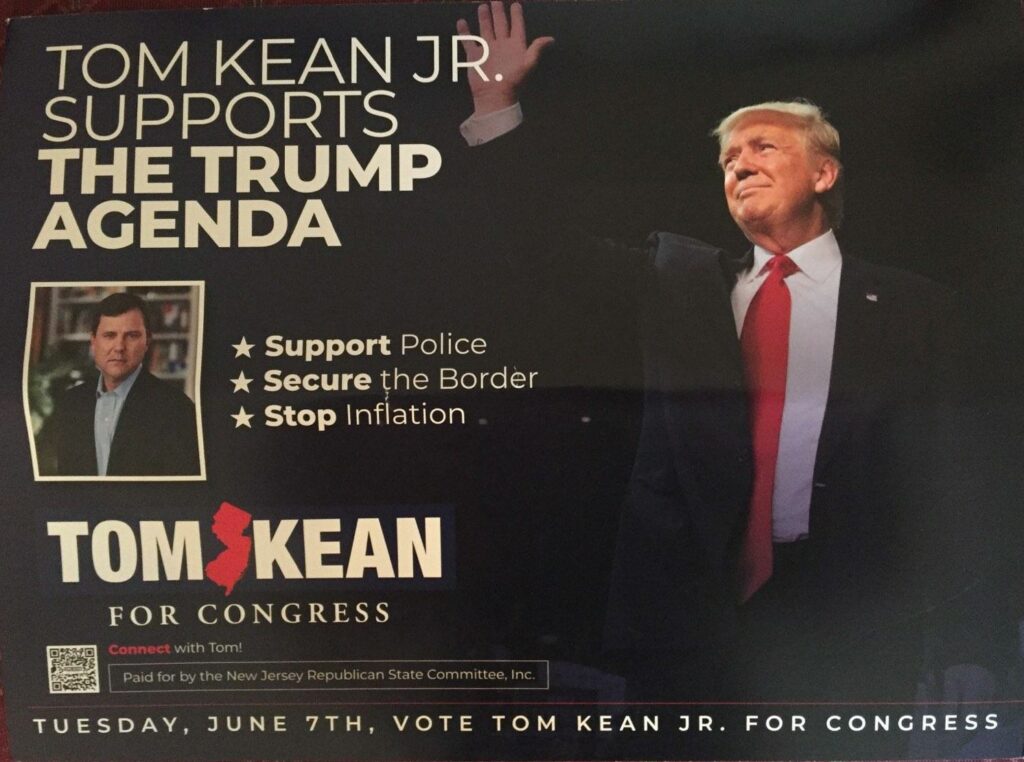 "Tom Kean Jr. Supports the Trump Agenda" says the headline on a campaign mailer circulating in CD-7 where Kean seeks the Republican congressional nomination in tomorrow's primary.