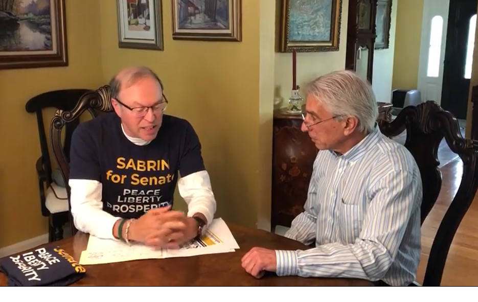 Sitting beside a Bob Hugin impersonator, Libertarian U.S. Senate candidate Murray Sabrin tries to engage the Republican nominee in a substantive conversation about issues only to meet a persistent refrain.
