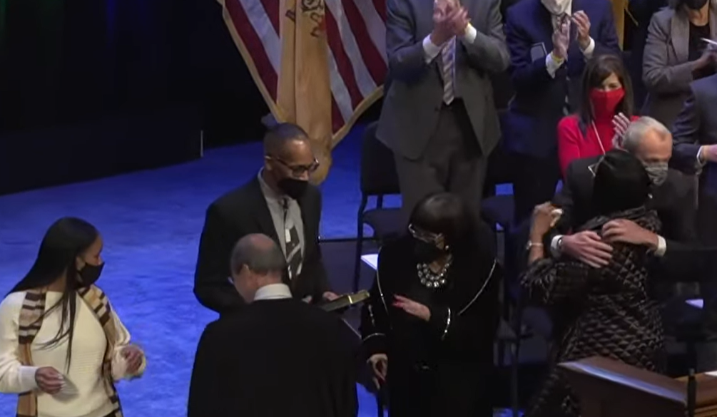 Lt. Governor Sheila Oliver takes the oath of office and receives an embrace from Murphy.