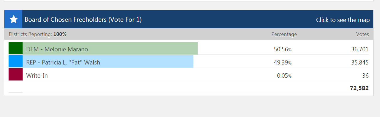 incumbent Republican Pat Walsh in her bid for a freeholder seat in her home county of Somerset. Marano's victory (by 856 votes at last tally, see above) shifted the freeholder board to 3-2 control by Democrats led by Chair Peg Schaffer (who's also vice chair of the Democratic State Committee).