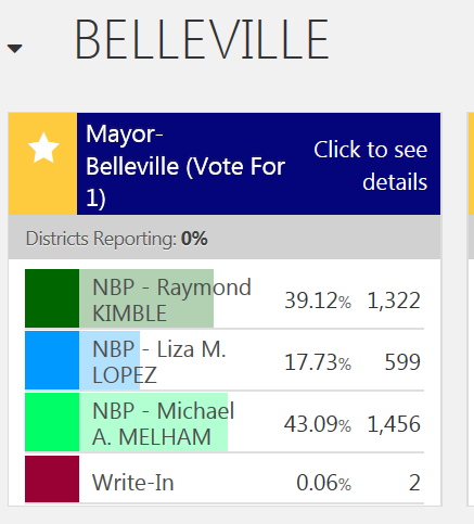 Melham Beats Kimble in Belleville By Insider NJ | May 8, 2018, 8:38 pm | in News Challenger Michael Melham tonight defeated veteran incumbent Mayor Ray Kimble in Belleville. Article Tags: Belleville Mike Melham Ray Kimble Click here for the full Insider Index