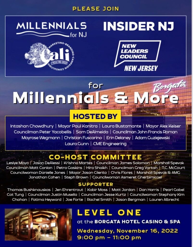 If you’re in Atlantic City for the League of Municipalities convention, be sure to attend the ‘Millennials And More’ reception on Wednesday evening at Gypsy Bar at Borgata. Insider NJ is among the many co-hosts of the event. You can RSVP here.