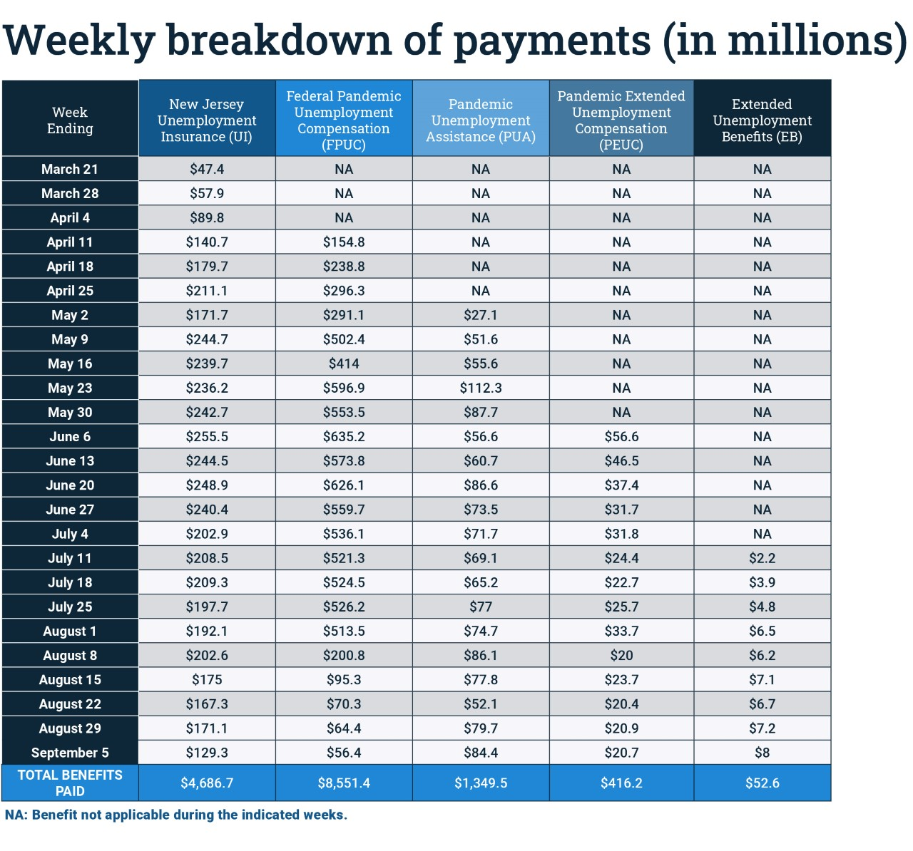 For the week ending Sept. 5, NJDOL paid out $298.8 million to eligible claimants. To date, a total of $14.9 billion in federal and state benefits has been distributed to New Jersey workers since mid-March.