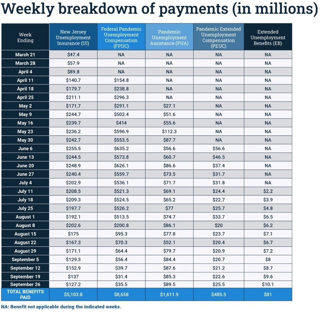 NJDOL has distributed $15.9 billion in federal and state unemployment benefits to workers who lost their jobs, were furloughed, or had their hours reduced in the pandemic, including $288 million for the week ending Sept. 26.