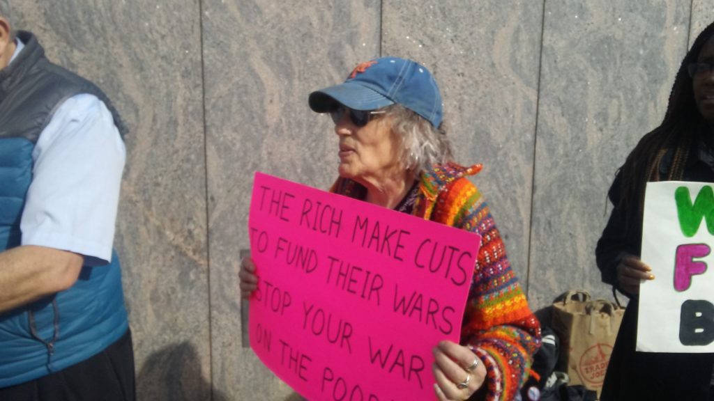NEWARK - Organizing in opposition to President Donald J. Trump's budget, the War Against Poverty Coalition protesters stood on Broad Street under a beating late day sun on Thursday, among them Bonnie Constag of Sayreville.