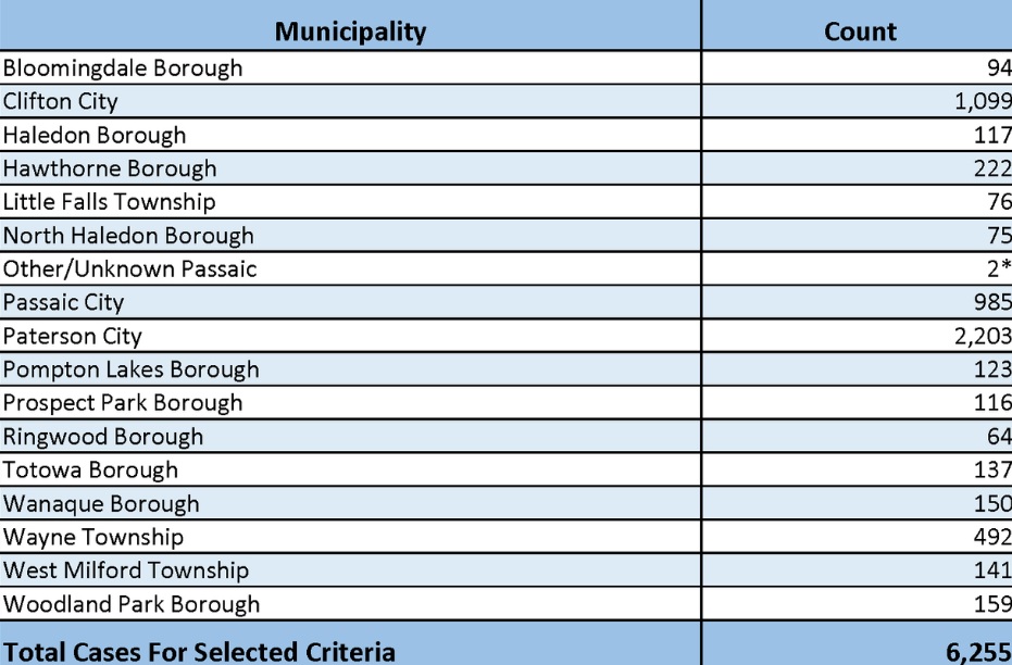 Two cities in the county have surpassed 1,000 cases: Clifton (1,099) and Paterson (2,203); Passaic City has 985 cases.